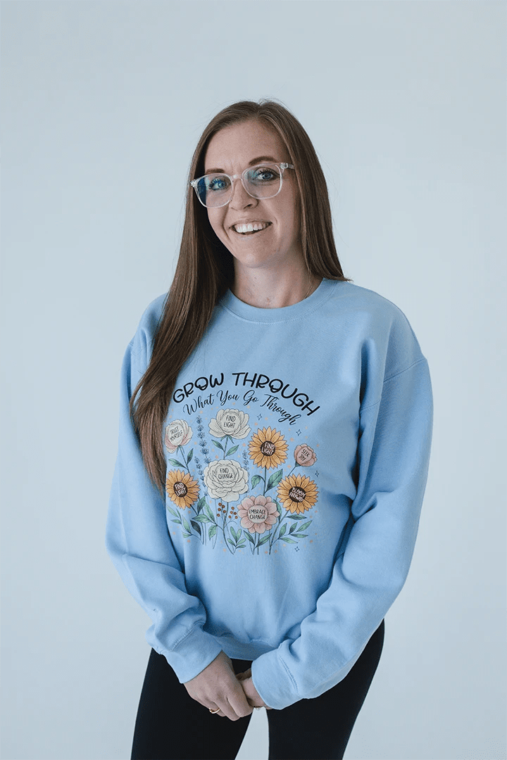 Life is full of seasons, and our "Grow Through What You Go Through" Crewneck is a beautiful, wearable reminder to keep blooming through it all. This serene light blue sweatshirt features an intricate, hand-illustrated garden of sunflowers, roses, and lavender, each carrying a hidden message of strength and positivity. It’s the perfect piece for anyone who finds beauty in the journey and isn't afraid to grow loud and proud.
